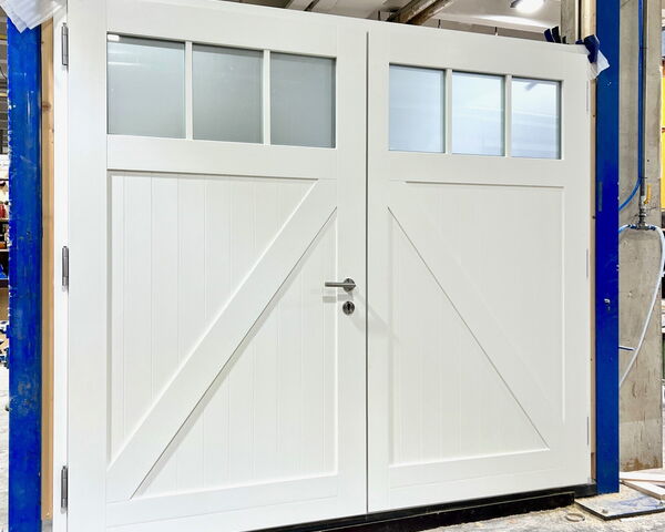 Besonderes Augenmerk lag auf den erhaltenen Fachwerkbögen – um diese zu bewahren, haben wir das 3880 x 2818 - 3795 mm große Flügeltor hinter der Laibung montiert.