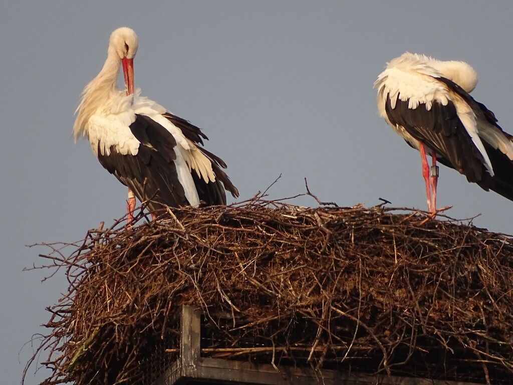 Ins warme Licht des Sonnenaufgangs getaucht sehen wir hier unsere beiden Grafenwiesener Störche bei der Morgentoilette. Für das ausgiebige Putzen des Federkleides nehmen sich die Tiere viel Zeit. Rund um die Regentalgemeinde sind die Adebare nach wie vor bei der Futtersuche zu beobachten. Wir sind gespannt, ob und wann sie in ihr Winterquartier aufbrechen.