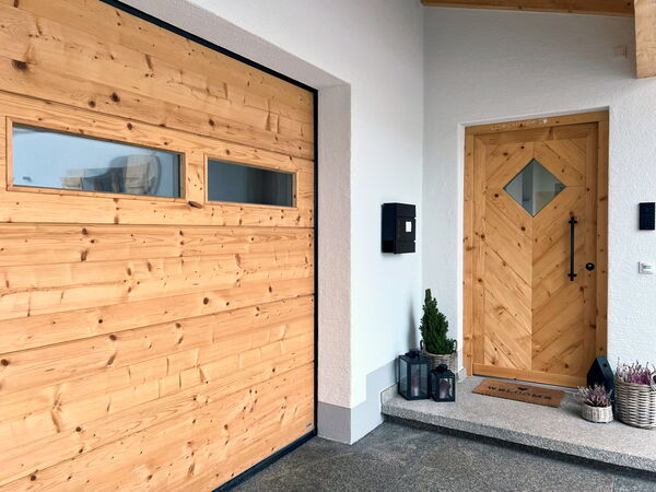 Nur ein paar Ortschaften weiter haben wir diese zwei Holz-Sektionaltore in Fichte Natur (gehackt und gebürstet) eingebaut. Perfekt abgestimmt auf die Holz-Schalung des Hauses betonen die ALLEMANN Sektionaltore den natürlichen, rustikalen und zugleich modernen Charme des Einfamilienhauses.