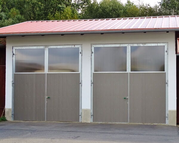 Metallrahmentore mit Trapezblech beplankt und Fenster dienen als Garagentore für eine LKW-Garage. Die Tore sind ca. 3,5 x 3,7 m und wurden auf Maß gefertigt. Verschluss:  ALLEMANN-Zuhaltung mit Riegelschloss.