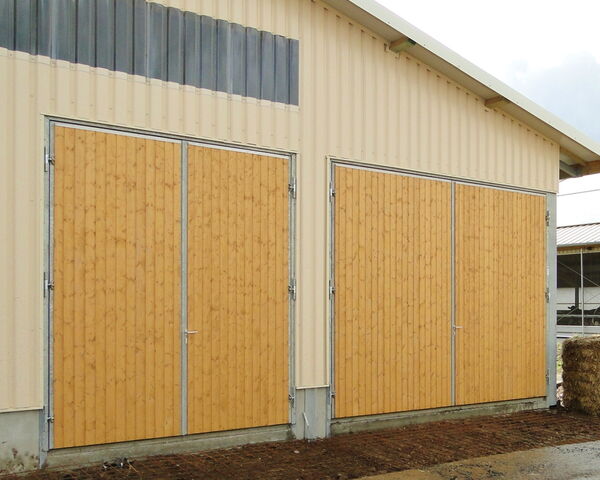 Bei einer großen Milchvieh-Stallanlage wurden Metallrahmentore in den Lauf- und Futtergängen sowie in den Technikräumen eingebaut. Die Ausführung ist mit Fichte-Profilbretter außen und innen abwaschbarer Platte.