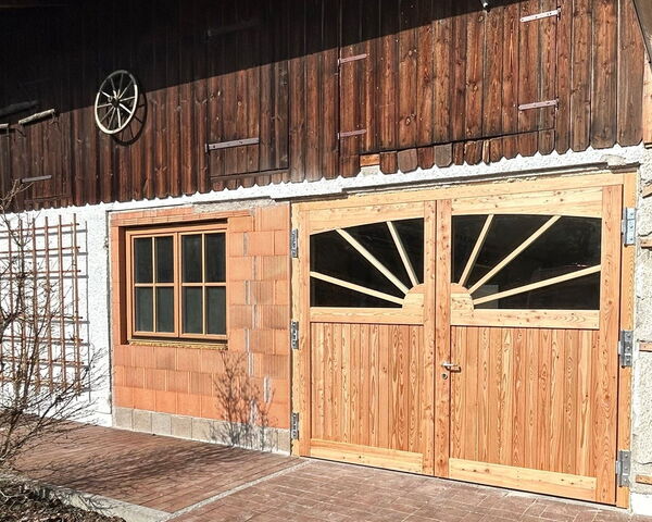 Bei der Renovierung eines Vierseithofes kam ein auf Maß gefertigtes Flügeltor mit Holzblockzarge zum Einsatz. Ein besonderer Blickfang beim 3270 x 2520 mm großen Lärche-Tor, sind die Sonnensprossen und außen aufgeschraubte Friese. Eine sehr zufriedene Kundschaft und auch unsere stolzen Handwerker, die das Eingangstor geliefert und montiert haben, sind das Resultat.