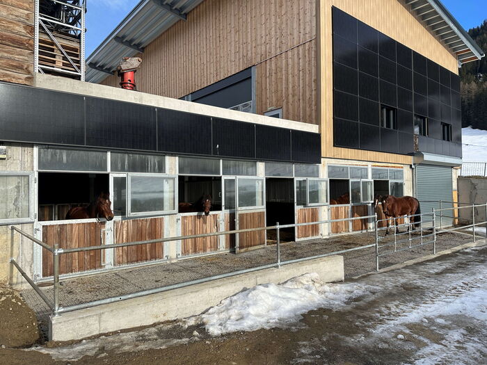 Auf über 1.500 m liegt der Pferdestall in Graubünden.  Vor 2 Jahren wurden die nach Kundenwunsch gefertigten Aussenboxentore mit Oberlicht in die Schweiz geliefert. Dieser Tage kamen aktuelle Fotos aus dem verschneiten Wintersportort - vielen Dank dafür.