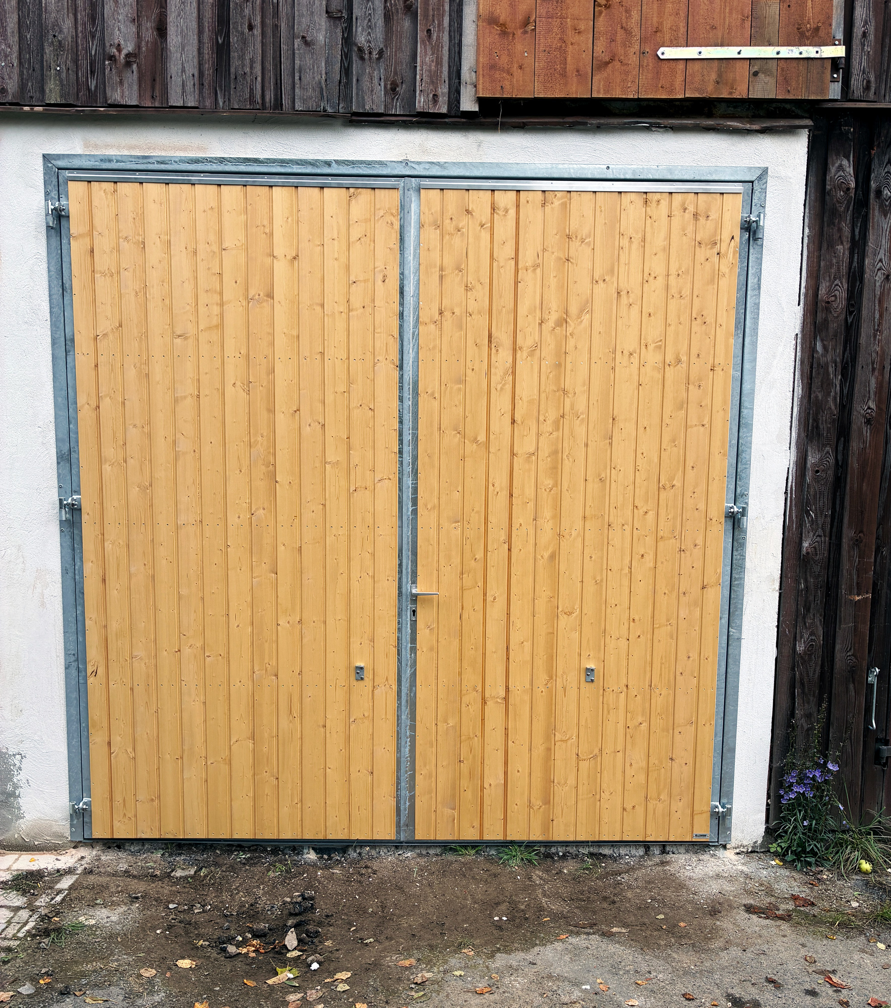 Flügeltüren und -tore mit Metallrahmen werden aus einem stabilen RP-Profil-Rahmen gefertigt. Die einfache Ausführung besitzt Fichte-Profilbretter auf der Außenseite, die wärmegedämmte Variante hat einen RP-Profilrahmen mit Doppelanschlag, 40 mm Isolierung, Dampfbremse, außen Fichte-Profilbretter und innen eine abwaschbare Platte.