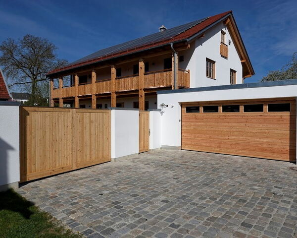 Machen Sie durch Form- und Farbgebung auch Ihre Eingangstür und Garagentor zum Unikat. Ob vollflächige Türblätter, Bogenformen, verschiedene Fensterausschnitte und unterschiedliche Oberflächengestaltung durch Sonderprofile, erfolgt die Herstellung stets nach Ihren Wünschen. Mit Lasuren in Naturtönen, die den Holzcharakter unterstreichen, oder eine Endbeschichtung im RAL-Ton nach Wunsch sind viele Gestaltungsmöglichkeiten gegeben. Beim Garagentor ist zudem ein elektrischer Torantrieb zum bequemen Öffnen und Schließen möglich.