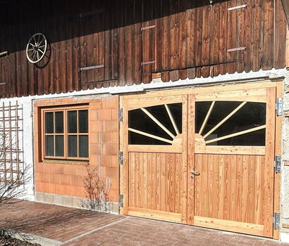 Bei der Renovierung eines Vierseithofes kam ein auf Maß gefertigtes Flügeltor mit Holzblockzarge zum Einsatz. Ein besonderer Blickfang beim 3270 x 2520 mm großen Lärche-Tor, sind die Sonnensprossen und außen aufgeschraubte Friese. Eine sehr zufriedene Kundschaft und auch unsere stolzen Handwerker, die das Eingangstor geliefert und montiert haben, sind das…